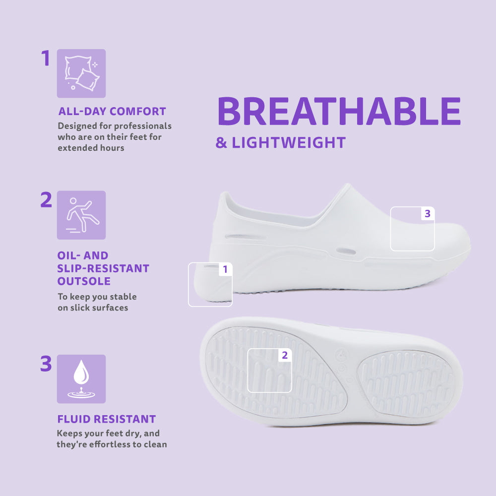 OIL- AND SLIP-RESISTANT OUTSOLE: These shoes feature a specially designed outsole that provides superior grip on both oily and wet surfaces, ensuring safety in fast-paced work environments like hospitals, kitchens, and restaurants.